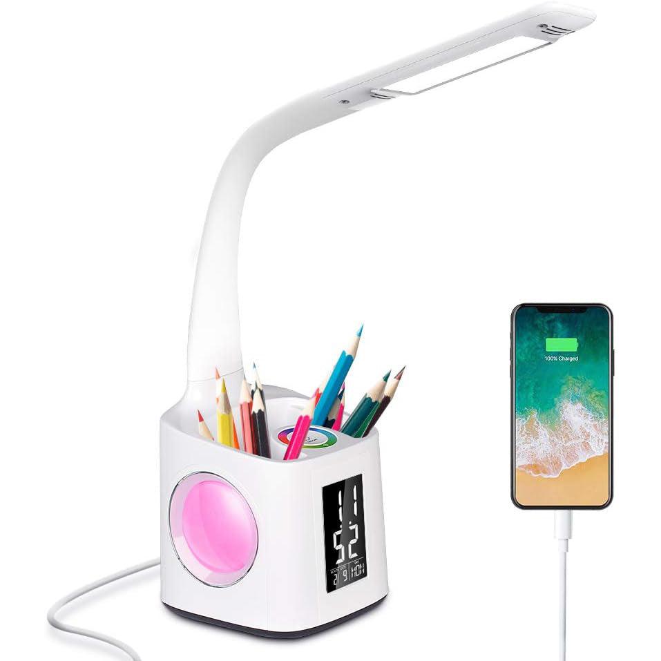 LED Desk Lamp with USB Charging Port&Pen Holder, Study Light with Clock